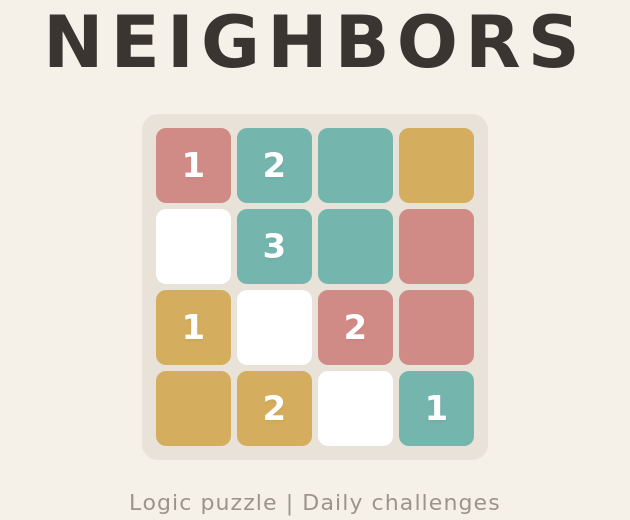 A logic puzzle where numbers tell you how many orthogonal neighbors share the same color.